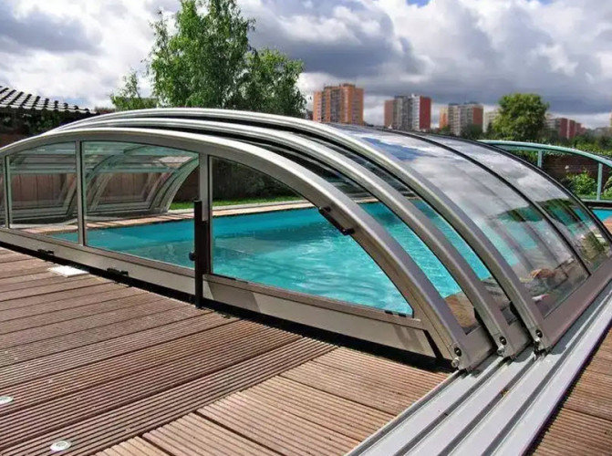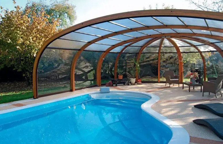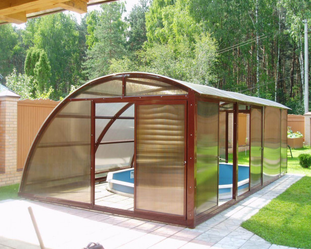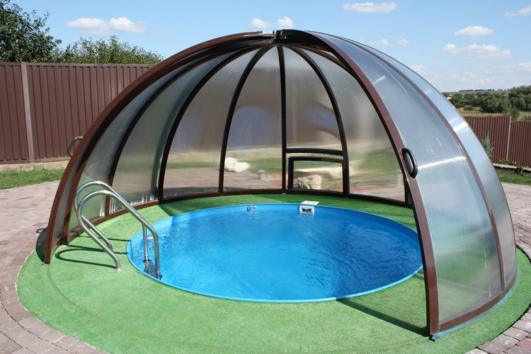 Изделие имеет полукруглую форму и прочный стальной каркас. Некоторые модели отличаются раздвижными секциями, которые накрывают бассейн как защитный колпак. Поликарбонат – это оптимальный материал для изготовления навесов, ведь он отличается небольшим весом (а значит, конструкцию легко устанавливать и демонтировать), хорошо пропускает свет и устойчив к воздействиям внешней среды.